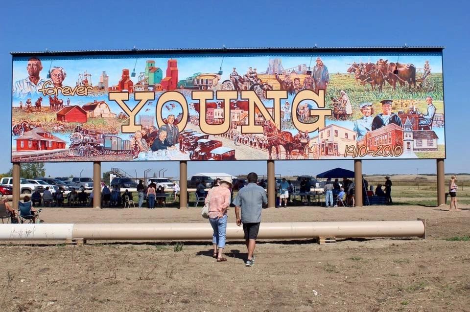 "forever YOUNG", a free-standing mega-mural installed just south of Young, SK.